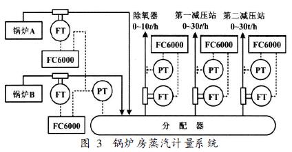 上海米其林輪胎公司新建兩臺(tái)35t/h鍋爐供3.9MPa飽和蒸汽。蒸汽流量使用渦街流量計(jì)測量,儀表配置如圖3所示。鍋爐投入運(yùn)行后,各路蒸汽分表的示值之和與總表經(jīng)平衡計(jì)算的差值≤1%R,發(fā)汽量與進(jìn)水量平衡測試結(jié)果也令人滿意。運(yùn)行三個(gè)星期后出現(xiàn)了新情況,即去除氧器的一套蒸汽渦街流量計(jì)示值有時(shí)會(huì)突然跳高,從而使分表之和比總表示值高約20%。