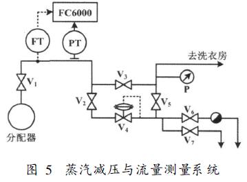 該實(shí)例發(fā)生在上海的一幢88層大廈。大廈所屬鍋爐房經(jīng)分配器向洗衣房供汽。因蒸汽壓力太高,所以中間設(shè)置了一個(gè)直接作用式減壓系統(tǒng)。減壓與流量測量系統(tǒng)如圖5所示。