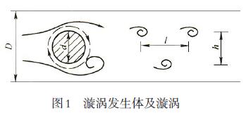 渦街流量計(jì)屬于速度式流量計(jì),是由漩渦發(fā)生體和頻率檢測器構(gòu)成的變送器、信號轉(zhuǎn)換器等環(huán)節(jié)組成。其測量原理是在流動(dòng)的流體中,若垂直流動(dòng)方向放置一個(gè)漩渦發(fā)生體,在某一雷諾數(shù)范圍內(nèi),將在漩渦發(fā)生體的后面的兩側(cè)交替產(chǎn)生有規(guī)律的漩渦(見圖1),旋渦列在旋渦發(fā)生體下游非對稱地排列。