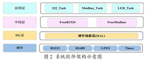 Modbus 通訊模塊的軟件架構(gòu)如圖 2 所示,分為硬件層、硬件抽象層,中間層和應(yīng)用層。中間層包括一個(gè)實(shí)時(shí)操作系統(tǒng)FreeRTOS 和一個(gè)針對(duì)嵌入式環(huán)境開發(fā)的輕量級(jí) Modbus 協(xié)議庫Freemodbus。在應(yīng)用層,主要?jiǎng)?chuàng)建了三個(gè)任務(wù),232_Task 負(fù)責(zé)讀 取和解析流量計(jì)表頭輸出的文本信息,Modbus_Task 負(fù)責(zé)存儲(chǔ) 解析后的流量計(jì)數(shù)據(jù)到 Modbus 寄存器表,以及以 Modbus 協(xié)議與取水監(jiān)測設(shè)備通信,LED_Task 是一個(gè)輔助任務(wù),主要用來提示程序運(yùn)行狀態(tài)。