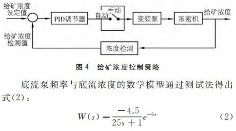 給礦濃度控制策略采用常規(guī)的PID調(diào)節(jié)器實(shí)現(xiàn),如圖4所示。在該控制系統(tǒng)中,給礦濃度設(shè)定值以及反饋的給礦濃度檢測值為PID調(diào)節(jié)器的輸 入,PID 調(diào)節(jié)器的輸出為變頻泵的頻率。該頻率可進(jìn)行自動與手動兩種控制模式。以變頻控制方式對濃密機(jī)的底流泵進(jìn)行精密轉(zhuǎn)速控制,即可控制濃密機(jī)排出的底流礦漿的濃度。