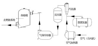 以原料萘為例。萘由原料儲罐經(jīng)液萘泵加壓后進入萘蒸發(fā)器,液萘在萘蒸發(fā)器內(nèi)由中壓蒸汽加熱汽化分離,經(jīng)流量調(diào)節(jié)閥、流量計和氣萘切斷閥后進入汽化器;空氣經(jīng)風(fēng)機加壓后,經(jīng)空氣加熱器加熱后進入汽化器,氣萘和空氣在汽化器內(nèi)混合均勻后進入氧化反應(yīng)器上部,經(jīng)催化床層發(fā)生氧化反應(yīng)生成苯酐和少量的副產(chǎn)物(以順酐、苯甲酸、萘醌、和鄰苯二甲酰亞胺為主);反應(yīng)氣體經(jīng)壓縮空氣計量表冷卻后再進入切換冷凝器進行凝華捕集,少量未被捕集的有機物和不凝氣體經(jīng)尾氣管路進入蓄熱焚燒裝置焚燒處理,焚燒后的尾氣達標(biāo)排放。