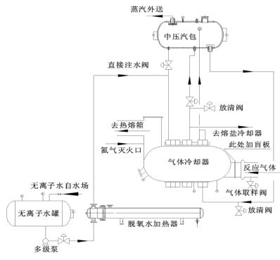 來自無離子水罐的脫氧水經(jīng)多經(jīng)泵加壓、經(jīng)脫氧水加熱器加熱后進入到壓縮空氣計量表的水段,脫氧水與反應(yīng)氣體換熱后分兩路:一路進入中壓汽包,保證汽包有穩(wěn)定的液位;一路進入熔鹽冷卻器帶出熔鹽攜帶的反應(yīng)熱。來自中壓汽包的高溫水經(jīng)管路接至壓縮空氣計量表汽段底部,高溫水與反應(yīng)氣體換熱后產(chǎn)生高壓蒸汽,高壓蒸汽又返回中壓汽包。汽包還有一路直接注水管路,此路水不經(jīng)過壓縮空氣計量表水段,而是直接進入汽包。在壓縮空氣計量表出口溫度偏低而汽包液位也比較低時,可開此直接注水管路來穩(wěn)定汽包液位。其詳細(xì)流程圖如圖 2。