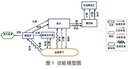 建立已有系統(tǒng)的功能模型(見圖 1)。通過功能模型分析,描述了系統(tǒng)元件及其之間的相互關(guān)系,并得出導致傳感器耐受溫度不足問題的功能因素:高溫蒸氣對測量管傳熱;測量管對探頭傳熱;探頭對灌封物傳熱;灌封物對壓電陶瓷片傳熱;高溫蒸氣對探頭傳熱。