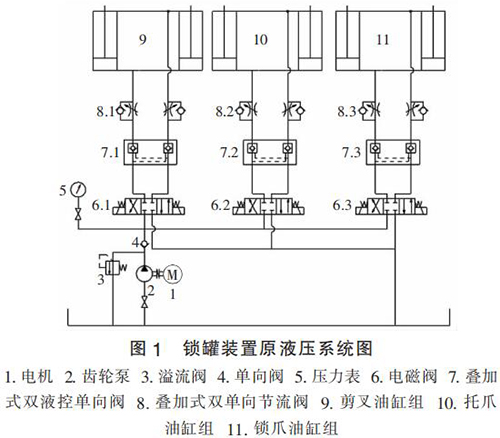 鍋爐水蒸汽流量計(jì)原液壓系統(tǒng)圖如圖 1 所示。 通過分析圖 1 發(fā)現(xiàn),原液壓系統(tǒng)中剪叉油缸組、托爪油缸組及鎖爪油缸組并聯(lián)安裝,并均由齒輪泵供油,該系統(tǒng)設(shè)計(jì)簡單,液壓元件選擇不夠合理,工作效率低,電機(jī)發(fā)熱大,主要存在的問題:
