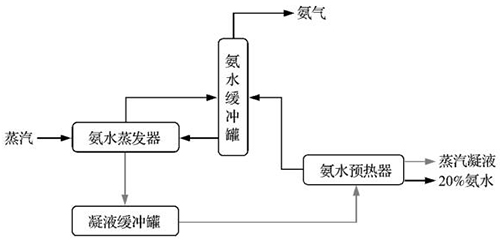 智能渦街流量計器為固定管板的立式熱虹吸再沸騰器,這種形式的換熱器造價低、占地面積小、傳熱效率高。智能渦街流量計器與氨水緩沖罐有安裝高度要求,氨水緩沖罐中的液體靠靜壓頭進(jìn)入智能渦街流量計器,被蒸汽加熱部分氣化后進(jìn)入氨水緩沖罐中進(jìn)行氣液分離。智能渦街流量計器采用0.8MPa低壓過熱蒸汽加熱,加熱后的蒸汽變?yōu)檎羝Y(jié)水,靠液位差進(jìn)入凝液緩沖罐。加熱蒸汽的流量根據(jù)氨水緩沖罐的液位通過DCS自動控制。