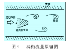 我廠對(duì)外供熱部分使用渦街流量計(jì)測(cè)量蒸汽流量。渦街流量計(jì)基于卡門渦街原理,原理如圖4。