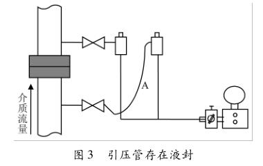 在用孔板測(cè)量蒸汽流量時(shí),通常要安裝2個(gè)冷凝罐,2個(gè)冷凝罐內(nèi)液位高度相等是差壓信號(hào)不失真?zhèn)鬟f的關(guān)鍵。這2個(gè)冷凝罐必須同高度安裝,底部是出口接變送器,冷凝罐的側(cè)面是入口接孔板側(cè),按照?qǐng)D2取壓。其作用有2個(gè):一是將蒸汽差壓信號(hào)轉(zhuǎn)換成凝結(jié)水的差壓信號(hào),以防蒸汽直接進(jìn)入差壓變送器高低壓室,燙壞儀表;二是保證引壓管兩側(cè)冷凝液位相同,起到平衡作用,冷凝罐截面積相對(duì)于引壓管截面來(lái)說要大很多,有利于維持冷凝水液位的相對(duì)穩(wěn)定。