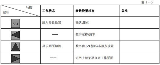 (3)標(biāo)況流量計(jì)算公式(若補(bǔ)償后單位為 U.0):(4)標(biāo)況流量計(jì)算公式(若補(bǔ)償后單位為 U.1):注:標(biāo)況指 20℃,1 標(biāo)準(zhǔn)大氣壓三、一體化液晶顯示表頭參數(shù)設(shè)置操作說明(V03Z)1、鍵盤按鍵說明2、 顯示窗字符說明注:表中 x 代表“0”或“1”;Zn:標(biāo)準(zhǔn)狀態(tài)下(20℃,1 標(biāo)準(zhǔn)大氣壓),被測(cè)氣體的壓縮系數(shù),Z:工作狀態(tài)下被測(cè)氣體的壓縮系數(shù)3、 操作說明3.1、本儀表表頭采用自導(dǎo)引式和菜單式相結(jié)合的參數(shù)設(shè)置方式,所謂自導(dǎo)引式參數(shù)設(shè)置方式就是用戶在進(jìn)入菜單 00 項(xiàng)后,表頭中的微電腦會(huì)自動(dòng)導(dǎo)引用戶去設(shè)置需要設(shè)置的參數(shù)。另外,用戶也可以通過菜單模式分別對(duì)各組參數(shù)進(jìn)行設(shè)置。蒸汽測(cè)量菜單框圖如下:3.2、參數(shù)設(shè)置約定:在設(shè)置各項(xiàng)參數(shù)時(shí),提示符閃動(dòng)代表該項(xiàng)參數(shù)沒有設(shè)置完或者尚未確認(rèn),可以通過按SET 鍵來確認(rèn)或者按→鍵退出;提示符不閃動(dòng)代表該項(xiàng)參數(shù)已設(shè)置完并確認(rèn),此時(shí)可以通過按 SET 鍵翻頁或者按→鍵退出。進(jìn)入?yún)?shù)設(shè)置時(shí),需要輸入密碼(6 位)并確認(rèn)進(jìn)入,為了防止誤進(jìn)入?yún)?shù)設(shè)置菜單,保證儀表正常工作,在設(shè)置密碼時(shí),使用↑鍵調(diào)數(shù)時(shí)不能循環(huán)調(diào)數(shù),只能單次調(diào)數(shù),只有密碼輸入正確進(jìn)入各項(xiàng)參數(shù)設(shè)置菜單后才可以對(duì)各位循環(huán)連續(xù)調(diào)整數(shù)據(jù)。3.3、儀表參數(shù)設(shè)置舉例:儀表出廠前各項(xiàng)參數(shù)已設(shè)置好,用戶無需設(shè)置。如果用戶需要設(shè)置某項(xiàng)參數(shù),請(qǐng)參照以下步驟,例如修改刻度流量值 QT:在工作狀態(tài)下,按 SET 鍵,顯示屏顯示 P,數(shù)字位為全零,8 秒鐘若無操作,自動(dòng)返回工作狀態(tài)。輸入密碼 :按數(shù)字↑鍵和左移←鍵,輸入密碼數(shù) xxxxx(出廠時(shí)默認(rèn)密碼為 000123),↑鍵調(diào)各位數(shù)字 0-9,每按 ←鍵一次數(shù)字向右循環(huán)一位,可通過多次按←鍵對(duì)整段數(shù)字清零,按→鍵可以返回工作狀態(tài)。菜單選擇項(xiàng):按 SET 鍵確認(rèn),顯示屏顯示如右圖所示,末行“00”閃動(dòng)調(diào)整該項(xiàng)值選擇不同參數(shù)設(shè)置菜單。該例直接按 SET 鍵進(jìn)入菜單 00 項(xiàng)設(shè)置刻度流量:QT 閃動(dòng),*一步:*先進(jìn)行小數(shù)點(diǎn)調(diào)整,可以通過←鍵對(duì)參數(shù)快速清零或者通過↑鍵進(jìn)行小數(shù)點(diǎn)調(diào)整,調(diào)整完畢,按 SET 鍵確認(rèn)(QT 仍閃動(dòng));*二步:數(shù)值調(diào)整,可以通過↑鍵對(duì)每位數(shù)字進(jìn)行調(diào)整,按 ←鍵一次數(shù)字向右移動(dòng)一位,調(diào)整完畢,按 SET 鍵確認(rèn),QT 停止閃動(dòng),該項(xiàng)參數(shù)設(shè)置完畢,可進(jìn)行下一項(xiàng)參數(shù)設(shè)置或者退出另外,單位設(shè)置 U.X 和補(bǔ)償方式設(shè)置 dX 通過↑鍵調(diào)整修改。3.4、校驗(yàn)項(xiàng)說明: 儀表出廠前,溫度和壓力通道已校驗(yàn)設(shè)置好,無需用戶重新校驗(yàn)。校驗(yàn)通道有密碼保護(hù),廠家不對(duì)外開放,如果需要重新校驗(yàn)溫度或者壓力通道,請(qǐng)專業(yè)人員與廠家技術(shù)人員聯(lián)系。4、計(jì)算公式說明4.1、蒸汽測(cè)量計(jì)算公式(1)渦街流量?jī)x表工況體積流量計(jì)算公式:(2)密度 d,單位 Kg/m3(3)質(zhì)量流量計(jì)算公式,單位 Kg/h:(4)質(zhì)量流量計(jì)算公式,單位 t/h:4.2、氣體測(cè)量計(jì)算公式----標(biāo)況指 20℃,1 標(biāo)準(zhǔn)大氣壓(1)渦街流量?jī)x表工況體積流量計(jì)算公式:(2)對(duì)比壓縮系數(shù) d(Zn/Z),單位 1(3)標(biāo)況流量計(jì)算公式,單位 Nm3/h:P1—工況絕壓,PN—標(biāo)況絕壓(Mpa),T1—工況熱力學(xué)溫度,TN—標(biāo)況熱力學(xué)溫度(K)