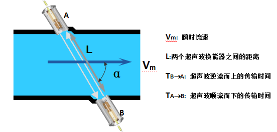 相比前兩種測量原理,超聲波時差法的原理則更加簡單易懂一些。與人們劃船或者游泳類似,超聲波在流動的流體中的傳播速度與流體的流速有關。順流而下的超聲波的傳播速度大于逆流而上的傳播速度。只要分別測量出超聲波順流和逆流的傳播時間,就可以依據(jù)下面的公式得到該路徑上瞬時流速。這樣,介質流量則可以通過流速、管道截面積等求得。