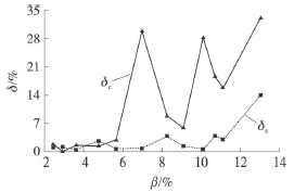 將試驗數(shù)據(jù)進行處理,得到了氫氣流量計測量誤差隨氣相含率變化的情況,如圖5所示。其中δs為譜分析方法的測量誤差,δc為脈沖計數(shù)方法的測量誤差。氫氣流量計的測量誤差用式(4)來計算。其中Qs為裝置中標準表測量出的管道總流量,Qt為試驗管段中氫氣流量計的測量值。將譜分析和脈沖計數(shù)得到的頻率值和儀表系數(shù)分別代入式(5)計算Qt值。從圖中可以看出氣相含率的增加兩種測量方法得到的誤差并不相同。當含氣率不高時,0<β<6%,譜分析法的平均誤差為1.226%,*大誤差為2.687%,脈沖計數(shù)法的平均誤差為1.583%,*大誤差為2.898%,因此譜分析法與脈沖計數(shù)法的測量誤差區(qū)別不大,譜分析沒有明顯的優(yōu)勢;在氣相含率進一步增加時,6%<β<14%,譜分析法的平均誤差為3.975%,*大誤差為14.058%,脈沖計數(shù)法的平均誤差為20.053%,*大誤差為33.130%,脈沖計數(shù)的方法得到的測量誤差遠大于譜分析方法。