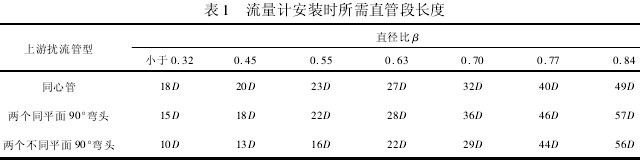 孔板流量計(jì)以簡(jiǎn)單結(jié)實(shí)、成本低廉及無(wú)需額外標(biāo)定等優(yōu)勢(shì)在工業(yè)中獲得廣泛應(yīng)用。但它也有自身的缺點(diǎn): 受限于工作原理,量程比限制在3∶ 1~5∶ 1; 在水錘作用下,孔板會(huì)變形,如果設(shè)計(jì)或安裝不當(dāng)甚至?xí)氯艿? 孔板的直角邊緣在長(zhǎng)期運(yùn)行后會(huì)磨損,特別是在進(jìn)行蒸汽介質(zhì)測(cè)量時(shí)會(huì)改變孔板特性,影響測(cè)量精度,因此必須對(duì)孔板進(jìn)行周期檢查并予以更換; 孔板流量計(jì)一般需要較長(zhǎng)的直管段以保證精度,表 1 給出了不同直徑比β和不同上游擾流布置情況下所建議的直管段長(zhǎng)度。
